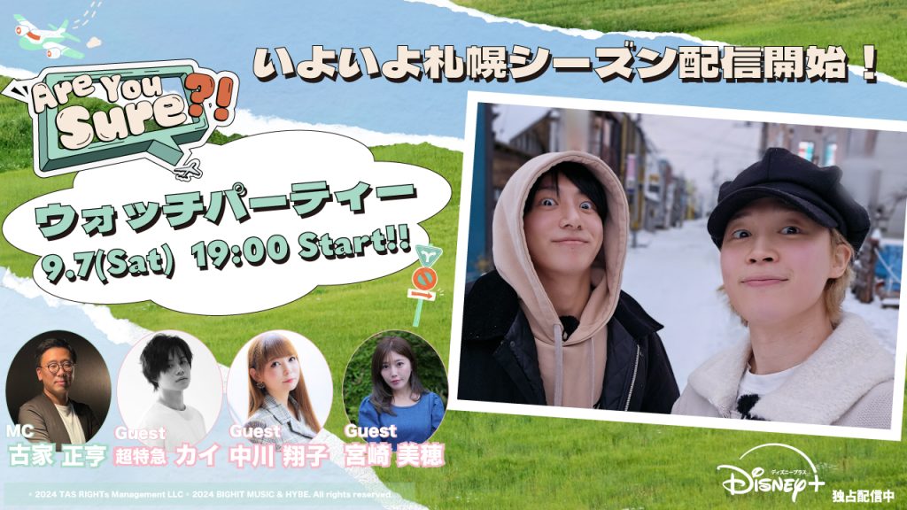 この度、待望の札幌エピソードの配信を記念して、一夜限りの『Are You Sure?!』ウォッチパーティーをニッポン放送公式YouTube にて 9 月 7 日(土)に開催することが決定!ゲストには、大の K-POP・BTS 好きで知られる超特急のカイ、中川翔子、そしてニッポン放送の特別番組『BTS マイ・ベスト・リクエスト』でパーソナリティを務めた宮崎美穂を迎え、生配信のスペシャルトークでウォッチパーティーを盛り上げる。MC を務めるのは、年 200 回以上の韓流・K-POP イベントの MC を担当し、韓流ファンから絶大な支持を得ている古家正亨。北海道出身かつ韓流・K-POP カルチャーに精通している古家にしか語れない、ここでしか聞けない『Are You Sure?!』札幌編考察トークにも期待が高まる。
