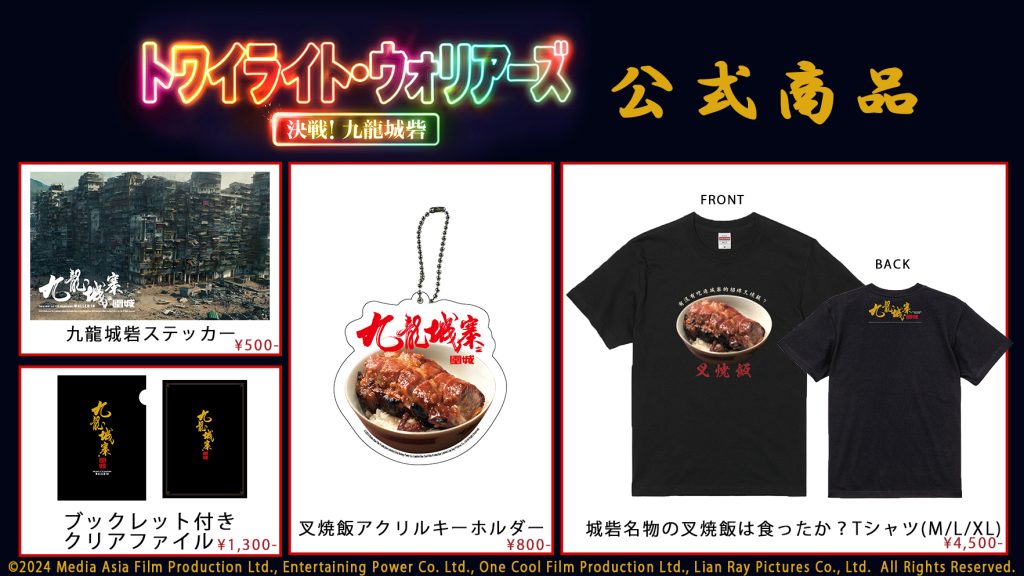 また、今週末より劇場にて発売となる映画グッズが解禁となった。映画情報満載のブックレット付きクリアファイル、城砦名物の叉焼飯は食ったか?Tシャツ、叉焼飯アクリルキーホルダー、そして九龍城砦ステッカーが販売となる。