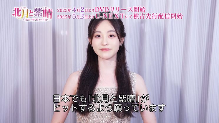 「こんにちは、チャン・ハンです。本作で第四王子の君北月(くんほくげつ)を演じました」と挨拶をするチャン・ハン。続けて「まもなく日本でリリースされるので、ご覧ください。皆さん、お楽しみに!」とブラックスーツで上品さも兼ね添えたイケメンぶりを見せつけた。一方、ジュー・シューダンは「日本の皆さん、こんにちは!ジュー・シューダンです」と手を振りながらキュートな笑顔で挨拶。「私の作品「北月と紫晴」が日本に上陸します。私はヒロインの韓紫晴(かんしせい)を演じました。本作はヒロインたちが悪を倒し、成長するハラハラドキドキの冒険物語です。韓紫晴は自分に正直で強い心の持ち主です。私もこのキャラクターが大好きです!」と役柄とストーリーを説明。さらに「名シーンもたくさんあり、韓紫晴と仮面の男が、ヌンチャクで対決する場面は、とても印象に残っています。日本でも「北月と紫晴」がヒットするよう祈っています。どうぞお楽しみに!」と見どころを含め日本のファンへアピールした。
