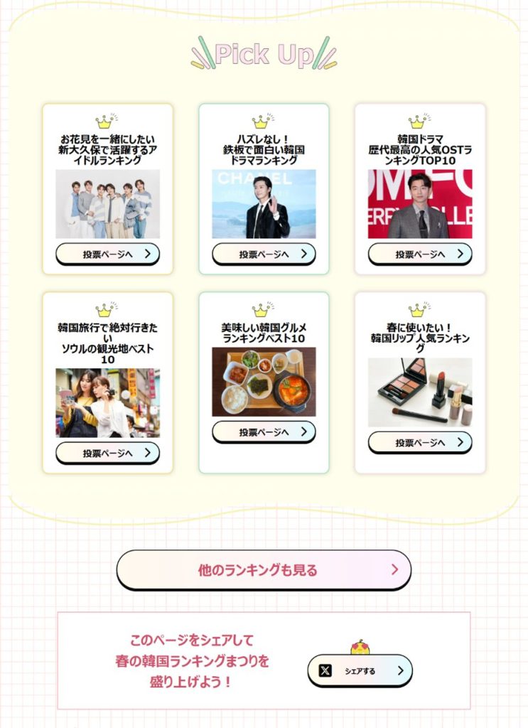 現在、春にぴったりのテーマから韓国旅行にまつわるテーマなど、様々なランキングを準備しております。会員登録の必要はなく、無料で気軽に投票できるので、この機会にぜひ新しくなったKboardのランキングへの投票をお楽しみください!