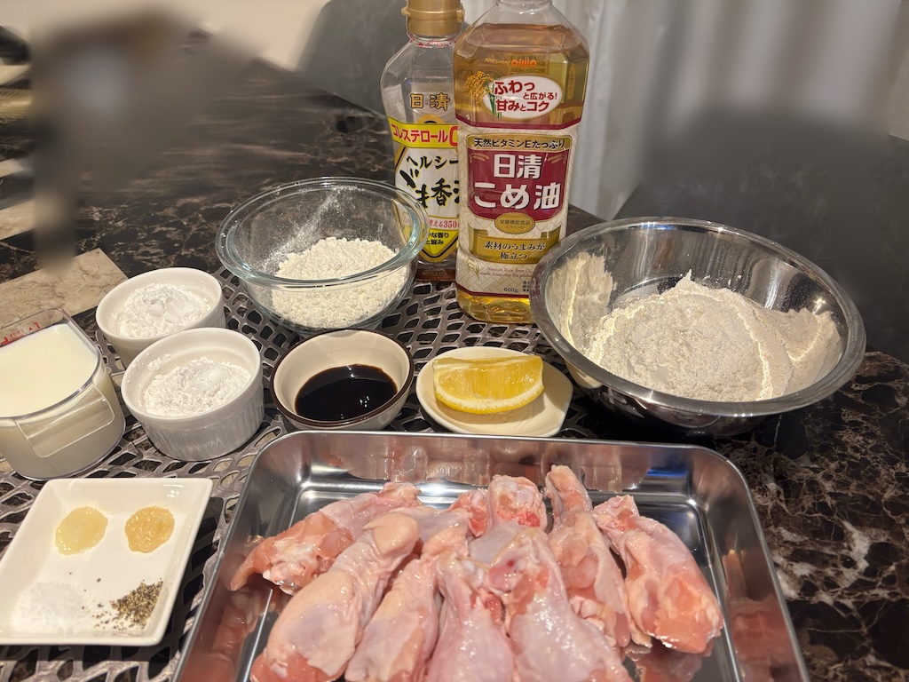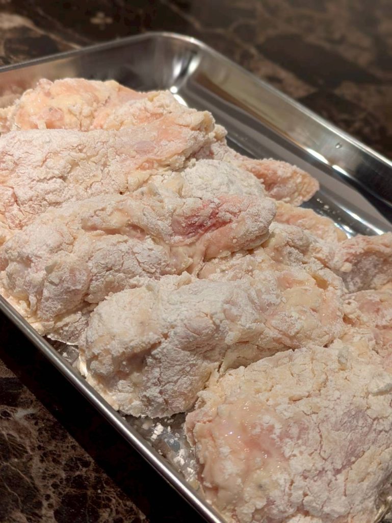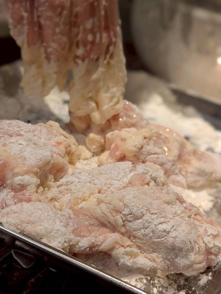 1時間後、味がしみしみになったチキンに、いよいよ衣をつけていきますよ〜〜♪