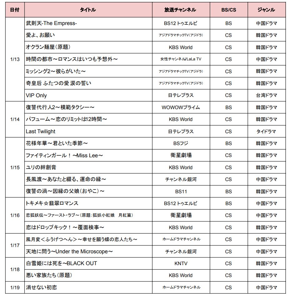 まずは、1月13日〜1月19日に始まるBS・CSの韓国・中国ドラマを一覧表でまとめてチェックしてみましょう。各ドラマの詳細リンクは曜日別の作品紹介にありますので、気になるドラマを見逃さないようぜひご確認ください♪