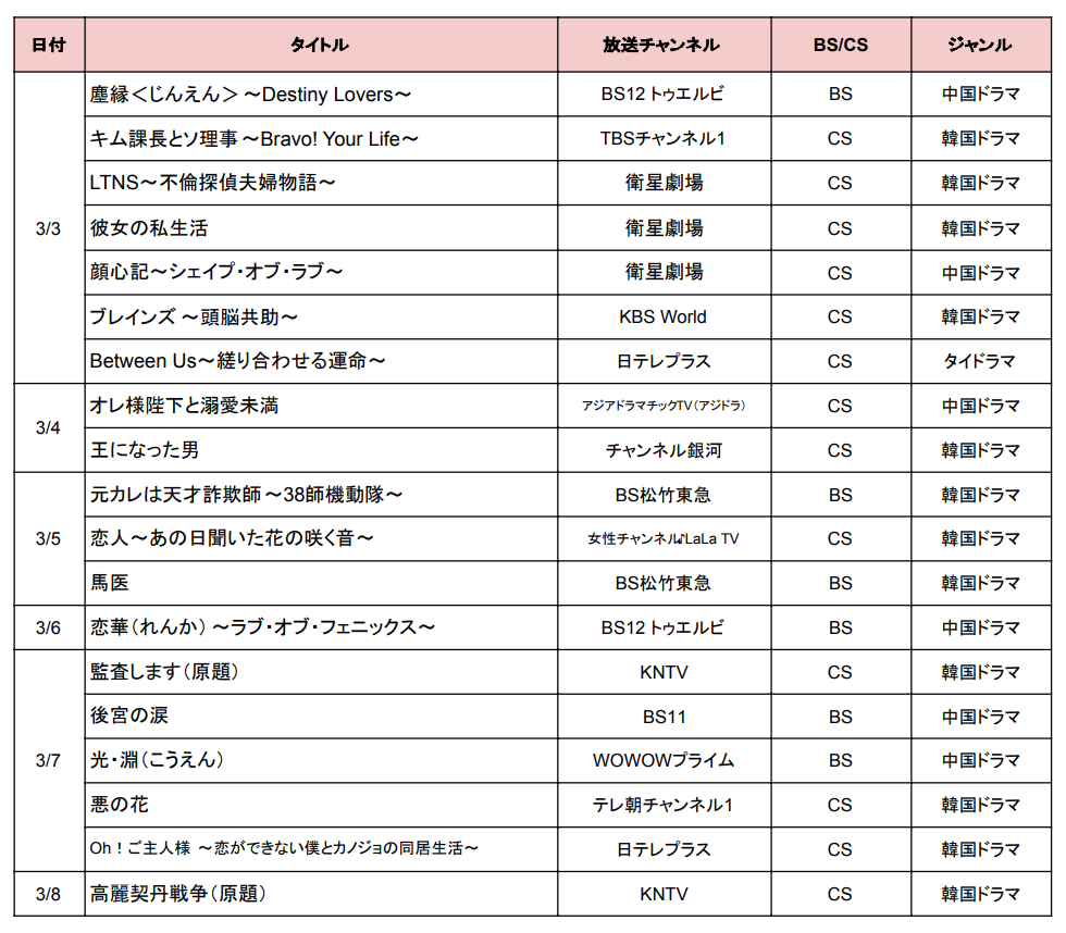 まずは、3月3日〜3月9日に始まるBS・CSの韓国・中国・アジアドラマを一覧表でまとめてチェックしてみましょう。各ドラマの詳細リンクは曜日別の作品紹介にありますので、気になるドラマを見逃さないようぜひご確認ください♪