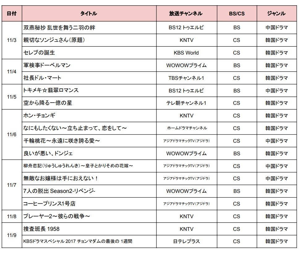 まずは、11月3日〜11月9日に始まるBS・CSの韓国・中国ドラマを一覧表でまとめてチェックしてみましょう。各ドラマの詳細リンクは曜日別の作品紹介にありますので、気になるドラマを見逃さないようぜひご確認ください♪