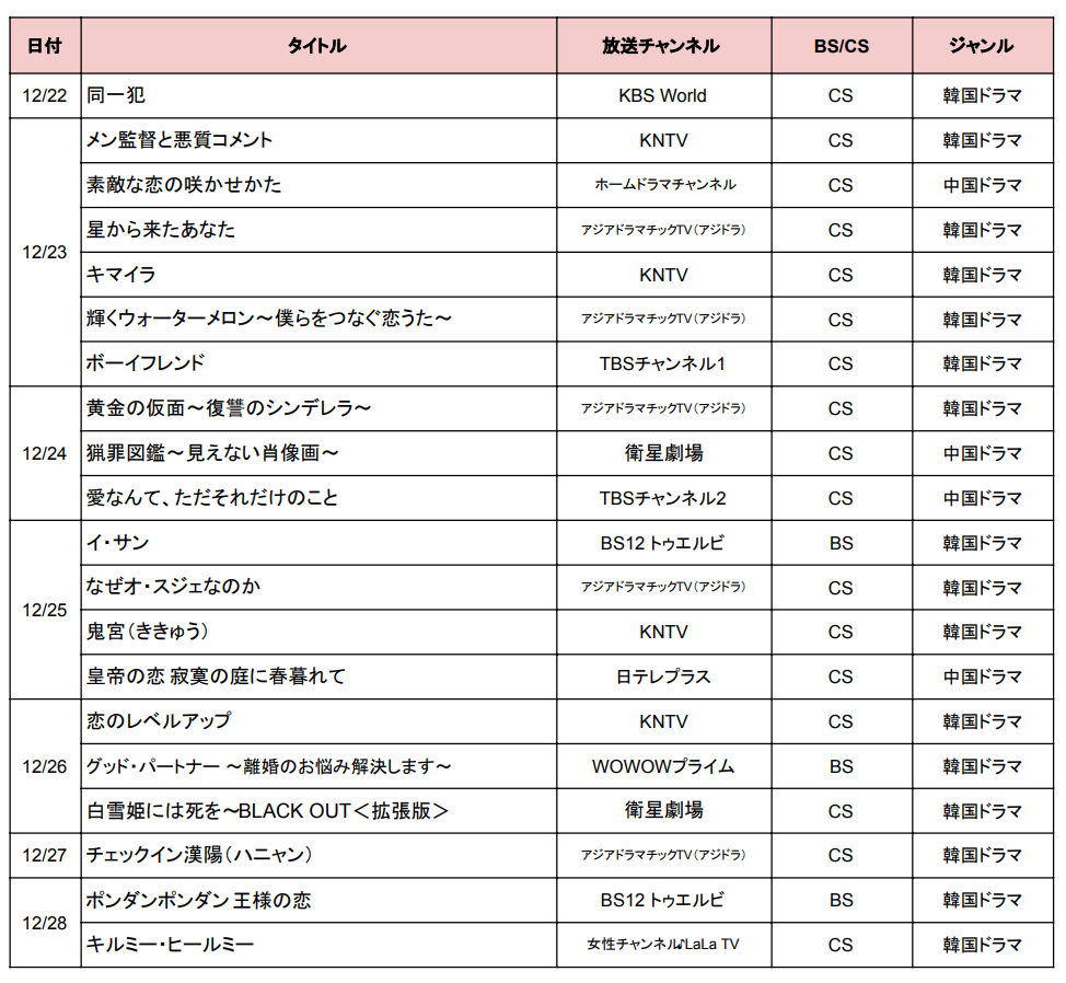 まずは、12月22日〜12月28日に始まるBS・CSの韓国・中国ドラマを一覧表でまとめてチェックしてみましょう。各ドラマの詳細リンクは曜日別の作品紹介にありますので、気になるドラマを見逃さないようぜひご確認ください♪