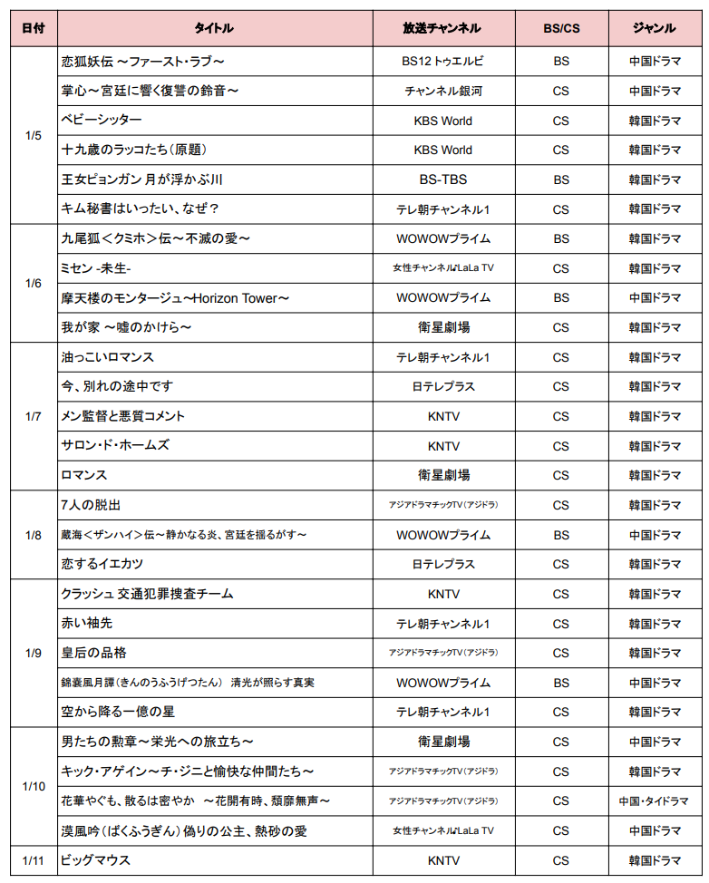まずは、1月5日〜1月11日に始まるBS・CSの韓国・中国・アジアドラマを一覧表でまとめてチェックしてみましょう。各ドラマの詳細リンクは曜日別の作品紹介にありますので、気になるドラマを見逃さないようぜひご確認ください♪