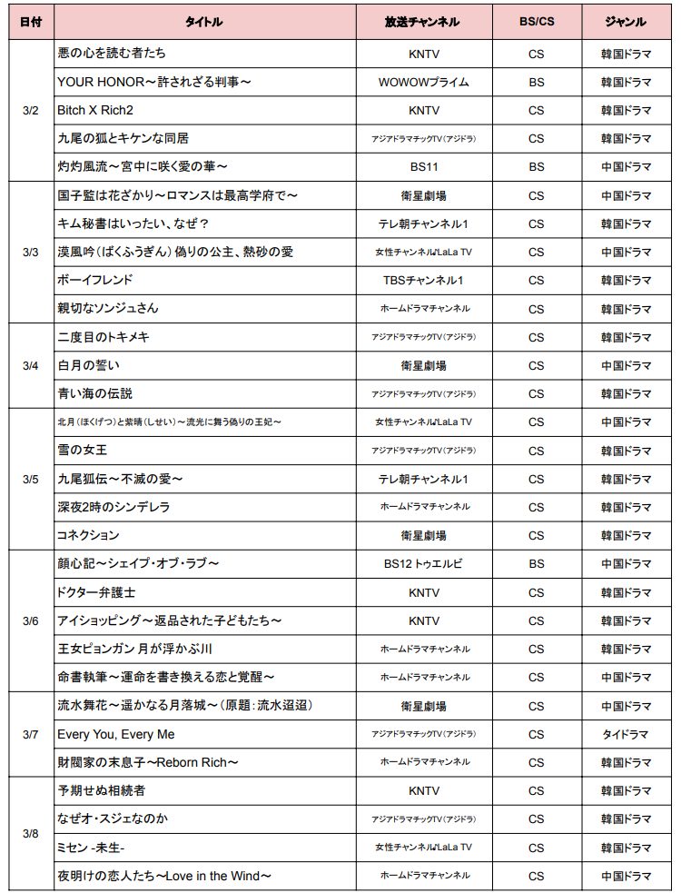 まずは、3月2日〜3月8日に始まるBS・CSの韓国・中国・アジアドラマを一覧表でまとめてチェックしてみましょう。各ドラマの詳細リンクは曜日別の作品紹介にありますので、気になるドラマを見逃さないようぜひご確認ください♪